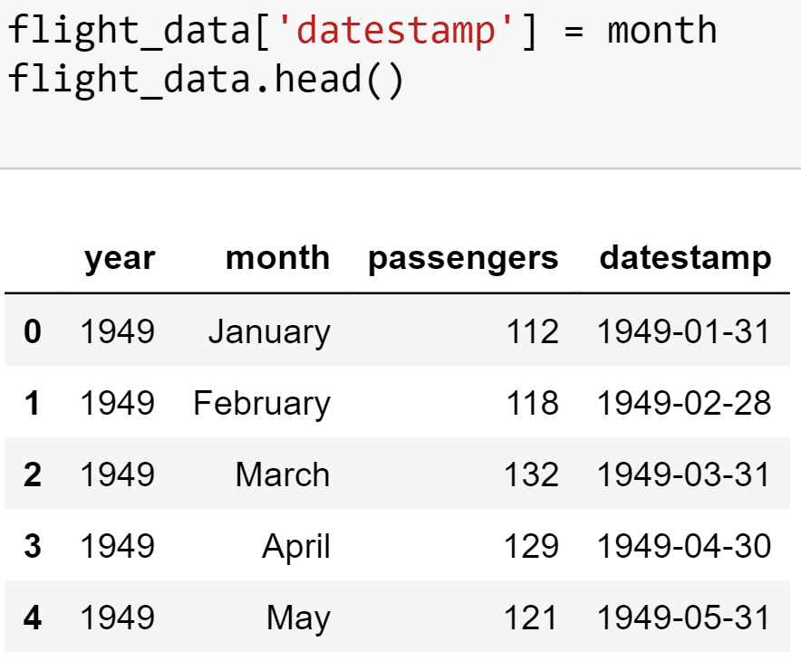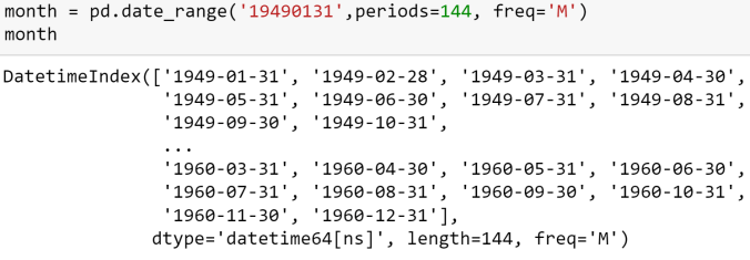Create a date range variable which captures date range of the above data. We are using Pandas “date_range” method to create timestamped variable on a monthly basis.