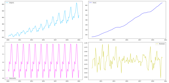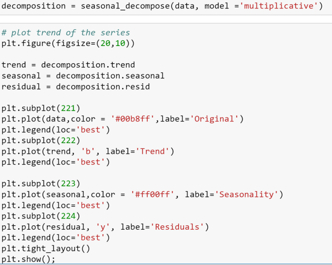 Decompose timeseries to trend, seasonal and random components using multiplicative model and do subplots with color schemes using hex color picker codes.
