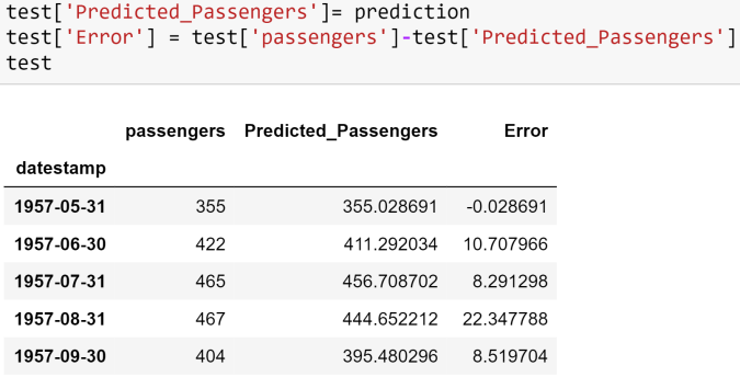 Add the predicted values in the original “Test” data to compute error in predictions. Sample output is shown below as well.