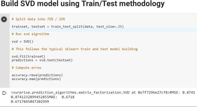 Now let’s switch gears and see how we can build recommendation engines in Python using a special Python library called Surprise. In this exercise, we will build a Collaborative Filtering algorithm using Singular Value Decomposition (SVD) for dimension reduction of a large User-Item Sparse matrix to provide more robust recommendations while avoiding computational complexity.