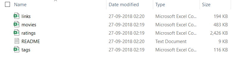 Download the zip files and you will see the following files that you can import in Python to explore. However, for the purpose of CF models, we only need the ratings.csv file.